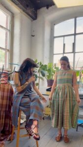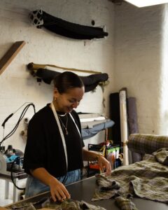 “So, I think it’s really lovely that we’re supporting British manufacturing again here. And there are not many places that are doing it like this.” The small factory setting not only keeps production local but also allows for a hands-on approach to garment-making. “I like how everything’s produced in this small factory together. We’re all part of making the clothes together, and it also gives us the opportunity to tailor garments.”