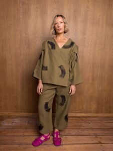 At the heart of Emiko Studios is a clear commitment to sustainability. From the outset, Coral focused on using natural or recycled fibres, steering clear of plastics, a decision shaped by her time working in fast fashion and a desire to do things differently. The brand grew from that foundation, sourcing fabrics from British mills and drawing inspiration from Asian silhouettes and vintage utility wear. Every piece reflects an eco-conscious ethos, grounded in ethical sourcing and thoughtful design.