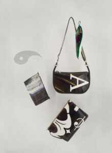 That philosophy laid the foundation for two distinct lines: the mainline label, Oscar Munro, and its more agile counterpart, YoYo. Instead of a traditional brand hierarchy, the two collections reflect the rhythm of his practice. YoYo operates on a commission-led model, producing adaptable accessories from excess exhibition materials and Munro’s own sourced deadstock, think repurposed sailcloth and hot-air balloon fabric transformed into one-off designs. This approach enables faster turnarounds and commercial collaborations while staying true to sustainable values.