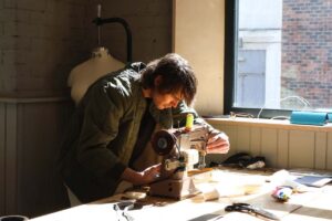 After University Munro’s creative journey was catalysed by his involvement with ōH Creative, a Chester-based design foundation known for its ethos of “Open Home.” What began as a stroll into a pop-up shop, where he spotted jackets by Bepo, quickly evolved into a transformative experience. After speaking with the store team, Munro was invited to take part in a maker’s weekend, bringing his sewing machine into the studio and becoming a resident designer. “Without that I definitely wouldn’t be where I am today,” he reflects. The store grew organically, attracting more creatives and eventually relocating to a larger space in the heart of Chester, so iconic that it even hosted a wedding.