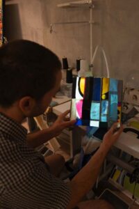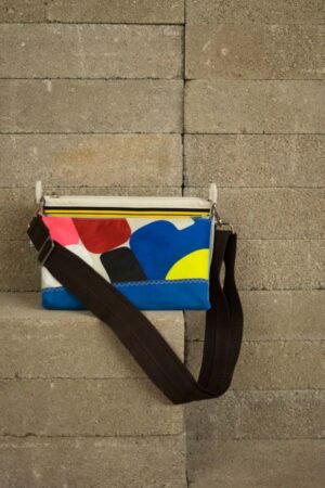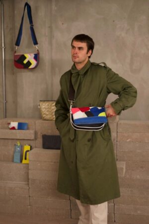 The resulting designs, abstract prints featuring stained glass imagery and religious symbols, formed the basis of his Jenny bags and marked a leap forward in his product development. Each piece was entirely unique, shaped by the irregularities of the repurposed fabric. In these imperfections, one can glimpse fragments of cathedral-stained glass and familiar architectural details, reimagined from a fresh perspective. The vivid colour palettes, subtle pixelation, and mesh-like textures lend each design a captivating, tactile quality that completes its visual story.