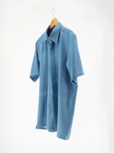 In contrast, Oscar Munro is intentionally slow, built around bespoke, made-to-order garments that demand time and precision. A defining example is the ‘Suntoucher’ shirt, crafted from denim chambray stock once displayed in the tailor’s shop where Munro worked. Rolled and left to absorb sunlight, the fabric developed natural, accidental dye patterns, each fold catching light differently, creating a piece that embodies his ethos of patience and purpose. Originally considered unsellable and destined for the bin, Munro saw potential in its imperfection. He salvaged the cloth and released a micro-collection of just five shirts, each bearing a unique sun-washed signature. The collection was supplied exclusively to UNDERFOUND in Altrincham.